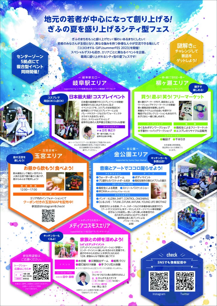 心踊るまちづくり実行委員会が主催し、地元の若者が中心となって岐阜市内5会場で実施した「ココロオドルGIFUsummerFES2023」の一環で、一般社団法人GLIPは、メディアコスモスエリアをランランチマーケットとして企画運営しました。週はじめの台風の影響で、雨が心配されましたが、絶好のお天気に恵まれ、多くのみなさんにご来場いただきました。特別企画のココリコ田中直樹さんのトークショーはじめ、ステージイベント、実行委員企画、各ブースでの催しなど楽しんでいただきました。