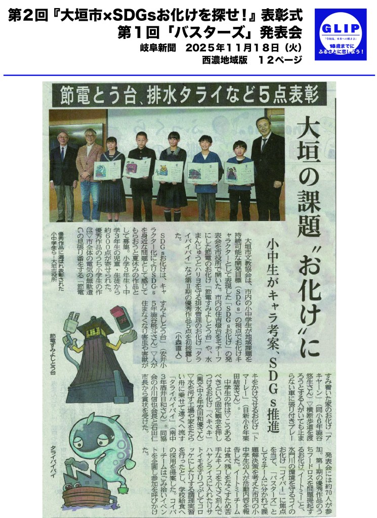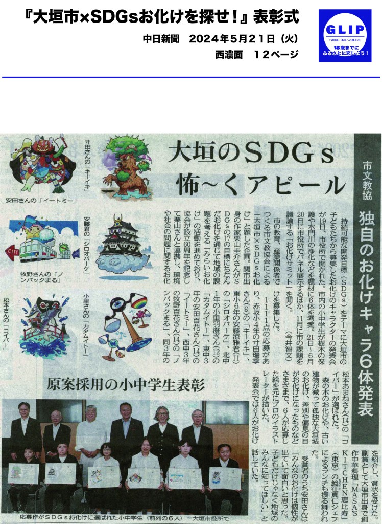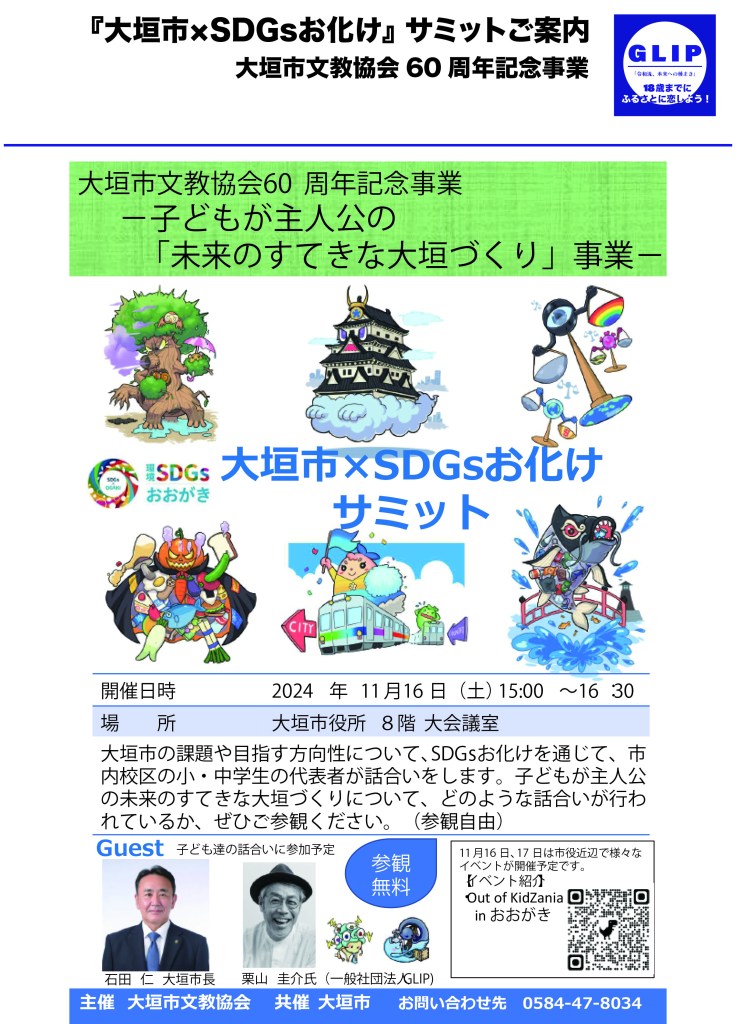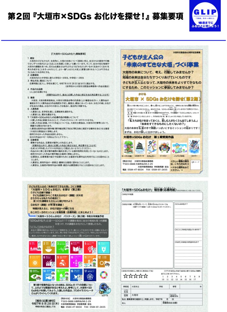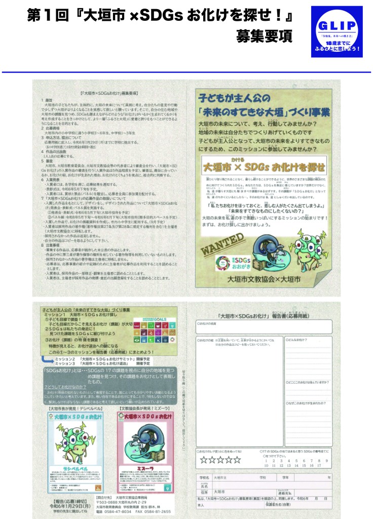 大垣市文教協会60周年記念事業として、子どもが主人公の「未来のすてきな大垣」づくり事業『大垣市×SDGSお化けを探せ!』を2回実施いたしました。市内の小中学生を対象に、地域課題をお化けに表現した作品を募集し、第1回は1,111作品、第2回は600作品の応募があり、それぞれ6作品、5作品を表彰致しました。第1回入賞作品から2作品のお化け退治法や共存法を考える「お化けサミット」にて協議し報告会を開催。他にフードロス削減のために考案されたメニューは給食の献立として検討され、市内のゴミ拾いイベントは定期的に開催されることになりました。