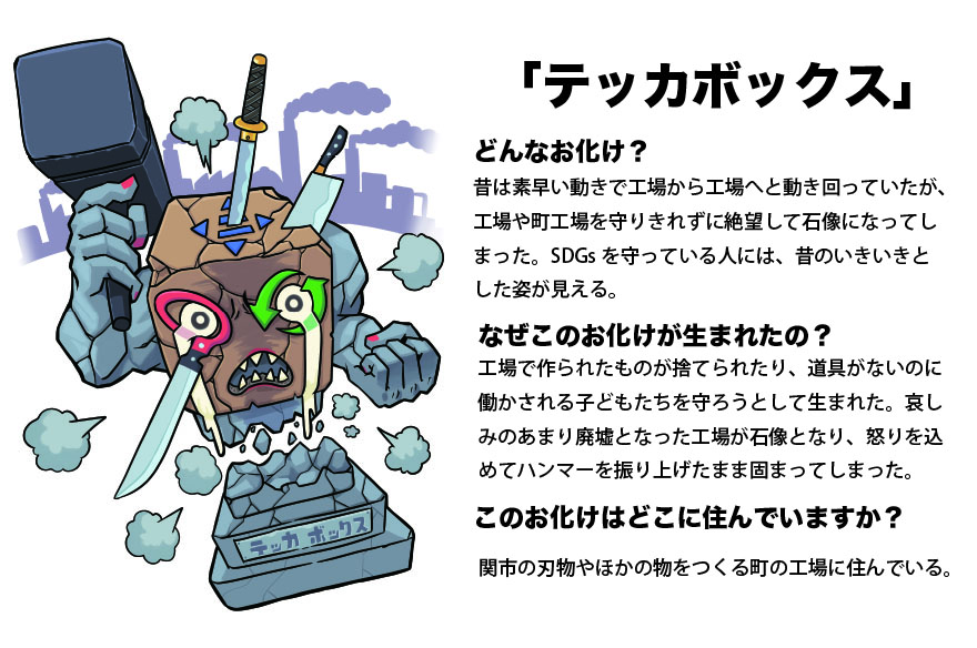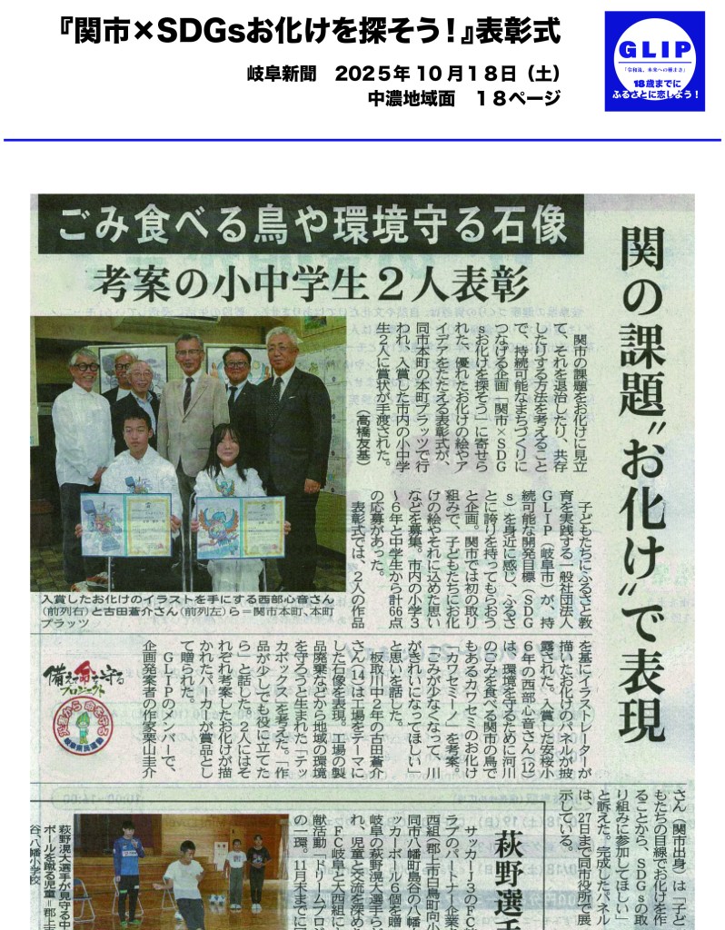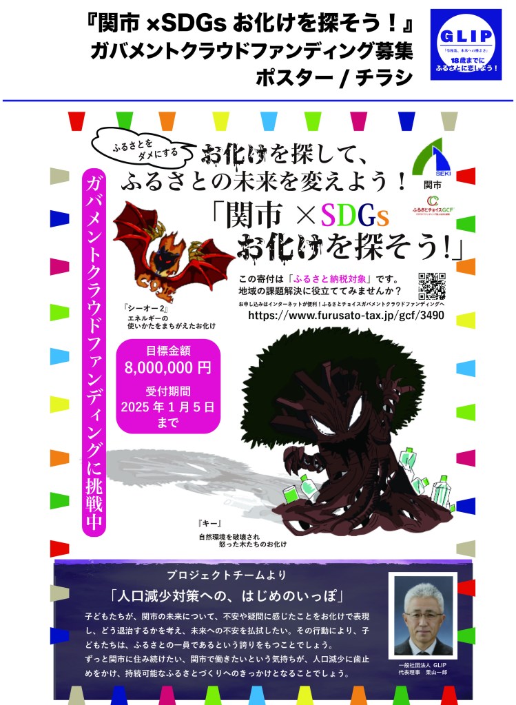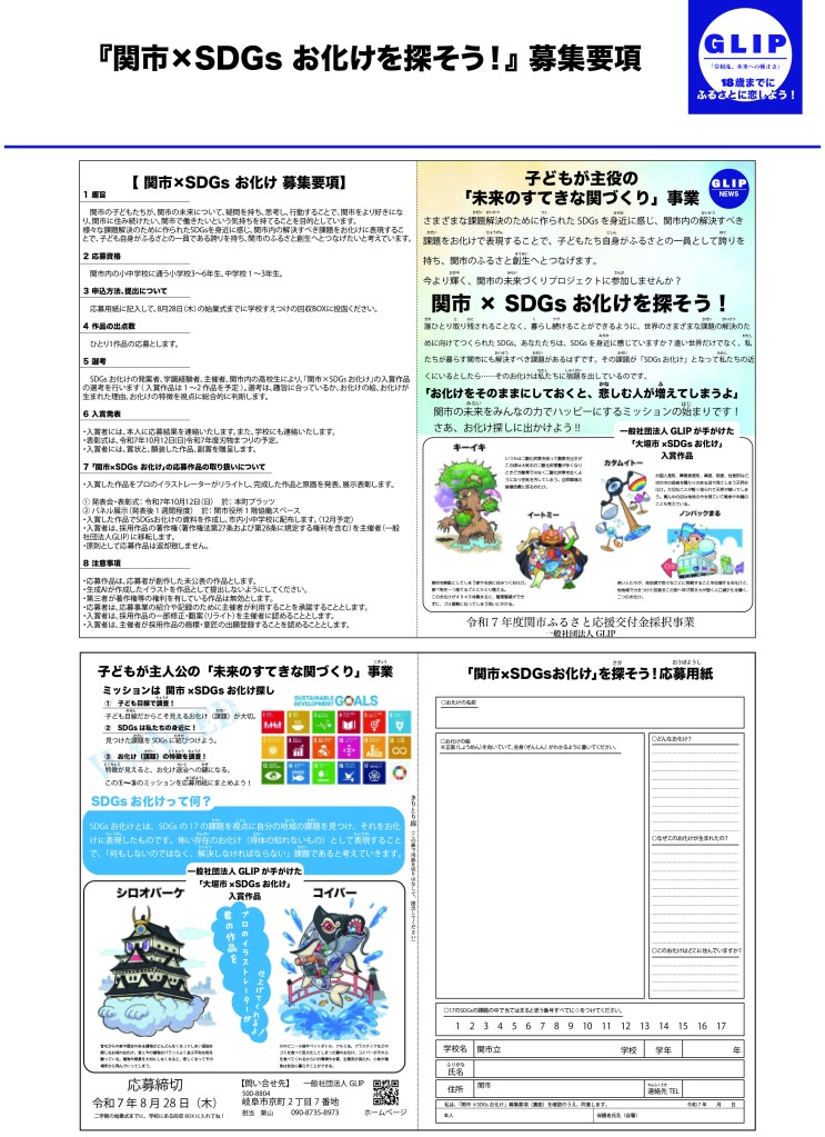 ふるさと納税制度を活用した、関市ふるさと応援交付金事業にて初の採択を受け、『関市×SDGsお化けを探そう!』を実施致しました。これは大垣市での発想を継ぐもので、市内の小中学生を対象に募集、66作品の応募があり、2作品を表彰致し、発表会は刃物のまち関市の「関市刃物まつり」内で実施致しました。