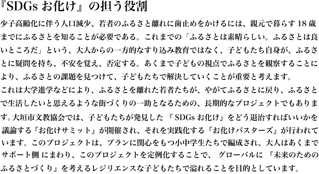 未来を担う子どもたちが、地域の課題や不安を『SDGsお化け』で表現し、どうしたらお化けを退治し、またはどうやって共存して地域が良くなるのかを柔軟に協議し、今よりも住みやすいふるさとづくりを考え、地域を支えるレジリエンスな人材に成長することを真剣に考えるプロジェクトです。