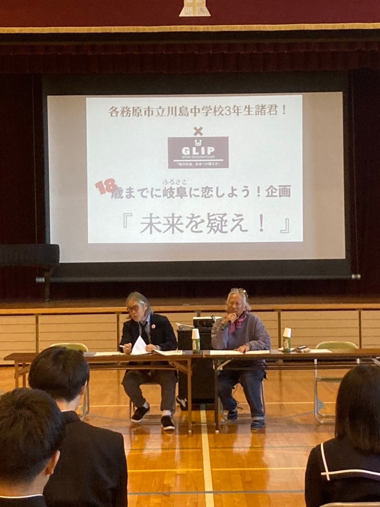 「未来を疑え!」をテーマに、事前に集めたアンケートの回答を紹介しながら、ライブ形式でトークを進めました。川島中学校でのキャリア教育は3年目になります。過去2回は、放送室から各教室へラジオ形式で実施しましたが、今回はじめて体育館にてライブ形式で実施しました。