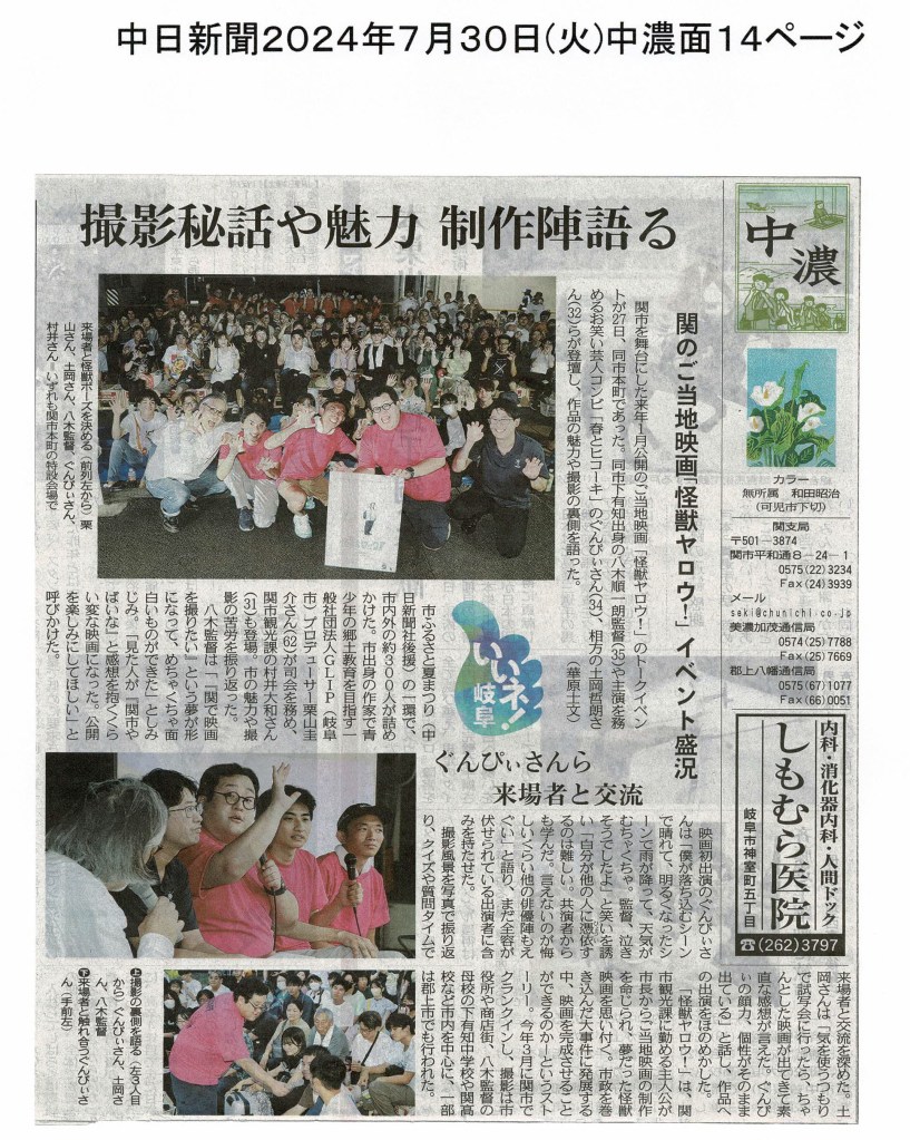 7月27日(土)に実施された関市ふるさと夏まつりで、ご当地映画『怪獣ヤロウ!』PRイベントとして、「夜空のふるさトーク」を実施し、300人を超える皆さんに来場いただきました。ました。