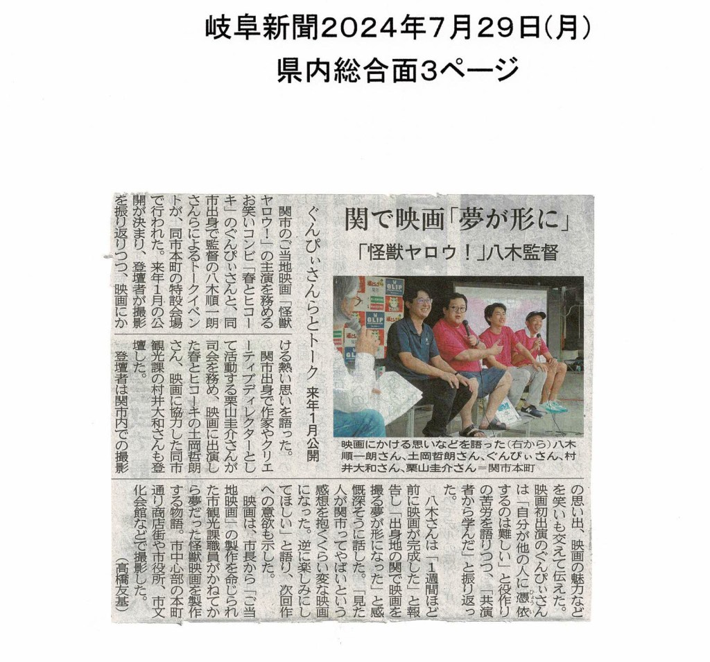 一般社団法人GLIPの栗山圭介が司会を務め、関市ご当地映画『怪獣ヤロウ 』主演のぐんぴぃ(春とヒコーキ)&関市出身の映画監督八木順一朗さんが登場、ぐんぴいさんの相方の土岡さんや関市観光課の村井さんも登壇され、約1時間半撮影を振り返りながらトークを繰り広げました。