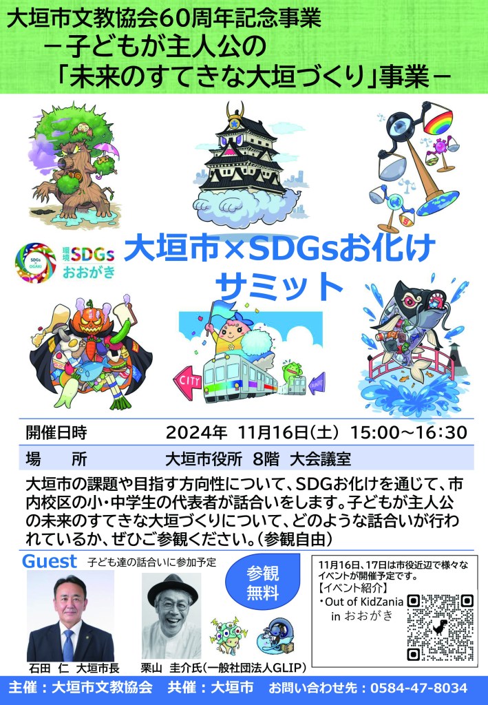 大垣市文教協会60周年記念事業-子どもが主人公の「未来のすてきな大垣づくり」事業-「大垣市×SDGsお化けサミット」が11月16日(土)に実施されます。大垣市の課題や、目指す方向性について、SDGsお化けを通じて、大垣市内の小・中学生の代表が話し合いをします。是非、ご参加ください。(参観自由、無料)