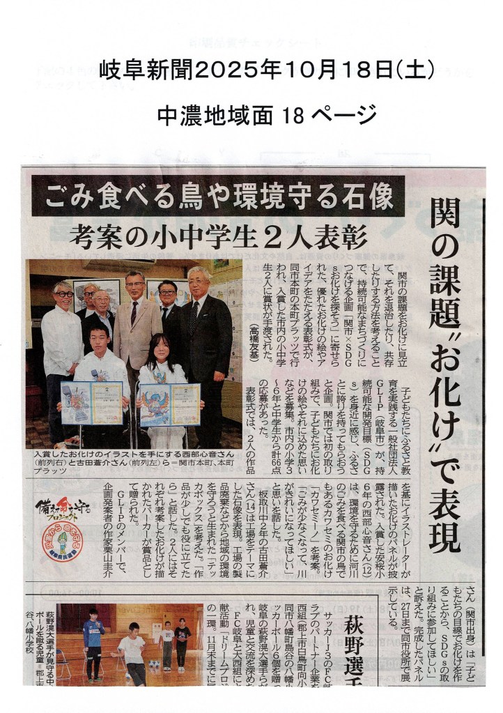 10月12日(日)に実施した「関市×SDGsお化けを探そう !」の入賞作品発表・表彰式の様子が、本日の岐阜新聞、中濃地域面18ページに掲載されました。