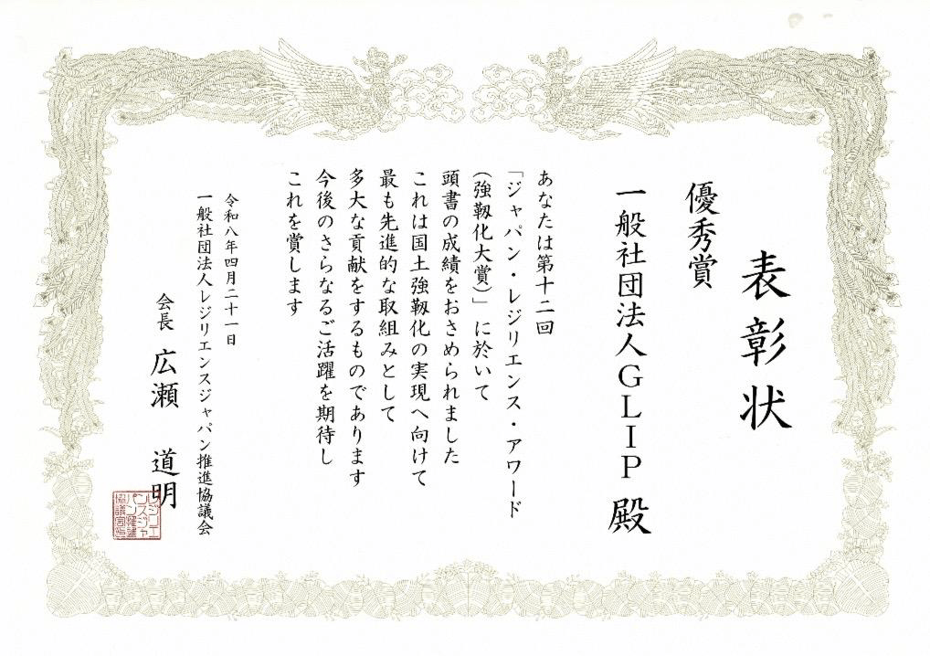 ジャパン・レジリエンス・アワードは、強くしなやかな国づくり、地域づくり、企業・産業づくり、ひとづくり等に資する活動・取り組みを表彰するもので、防災・減災・国土強靱化に資する技術、製品、サービス等の開発、販売を実践している企業、団体、地方自治体を表彰する強靱化大賞と、優れた国土強靱化地域計画の計画策定及び改訂を実施された地方自治体を表彰する地域計画賞のふたつのカテゴリーに分かれ、当法人が受賞した優秀賞は強靱化大賞となります。